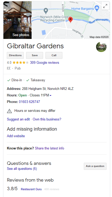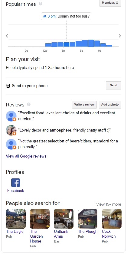 Should people search for your business, for example a pub, restaurant, office and so forth, your audience will find out more information about your company with open times, availability, address, contact number, website and so much more!